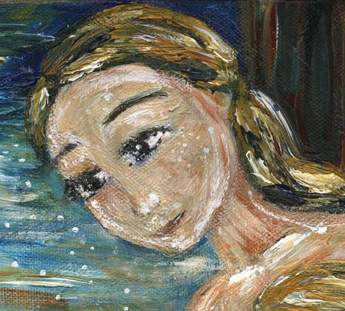 This new painting features a mother and child in the water and brings me to the intense feelings of pretector that I feel when I am in the water with my boys ~ this began as a bathers painting, then quickly expanded and began, for me, to relate to the mystery and magic of that sauna night. I allowed this painting to take the name I’d been saving. For this painting, from the beginning, I knew I wanted water and I knew I wanted the child’s face close to the mother’s breast, other than that, they led me to where they are today.